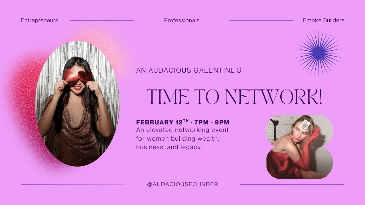 The Audacious Galentineâs is an intimate, elevated networking evening for female entrepreneurs and professionals who want real connection, thoughtful conversation, and proximity to women who are playing the long game.